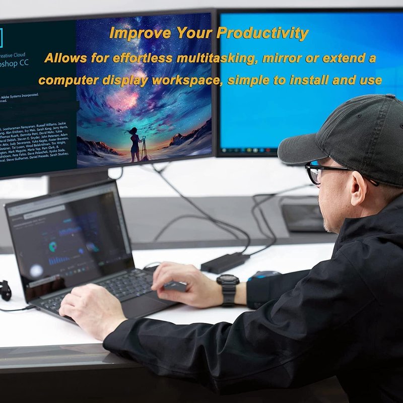 - Features a hybrid 2-in-1 cable, the dual monitor adapter is easily connected to USB-C, USB-A, thunderbolt 3/4, USB 4 devices and then mirror or extend your screen content to greatly improve your work efficiency.