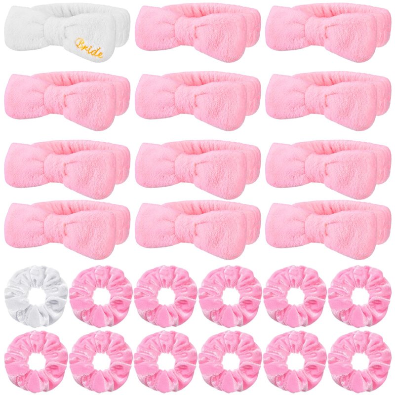 - Bachelorette Party Favors: get the bachelorette party gifts with our package that includes 12 bride bridesmaid spa headbands (1 white bride spa headband and 11 pink bridesmaid spa headbands) and 12 bride bridesmaid velvet scrunchies (1 white velvet hair scrunchie for bride and 11 pink velvet hair scrunchies for bridesmaids), enough in quantity as bachelorette themed party favors