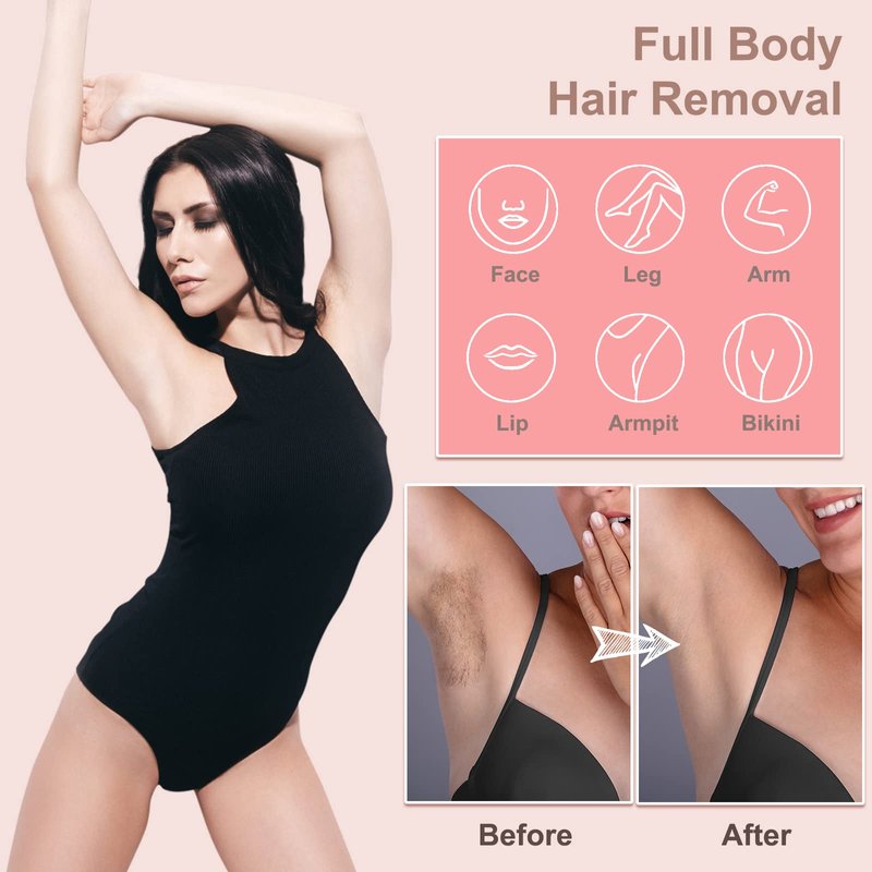 Targets both coarse and fine hair removal on full body parts, such as the face, eyebrow, armpits, arms, legs, chest, back, Brazilian, and Bikini.