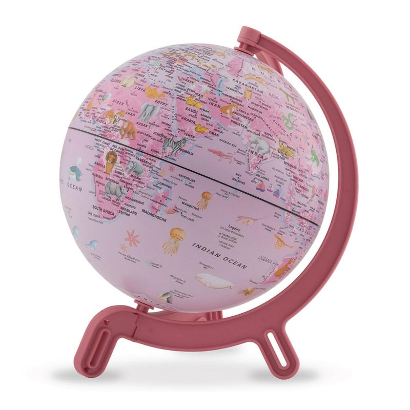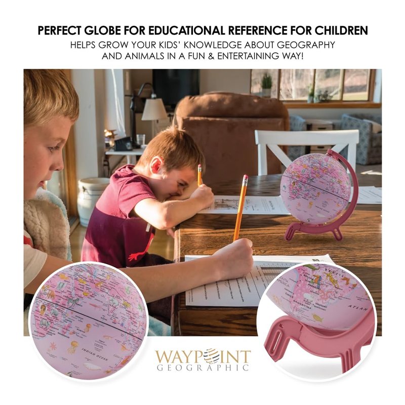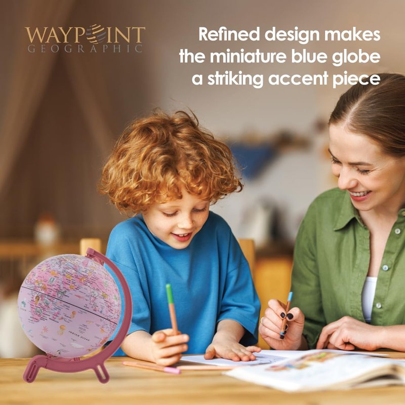 - Mini World Globe: Waypoint Geographic’s 6” Giacomino Globe with physical earth shadings is a beautiful mini globe with large text and bright colors that makes geography learning enjoyable for kids of all ages.