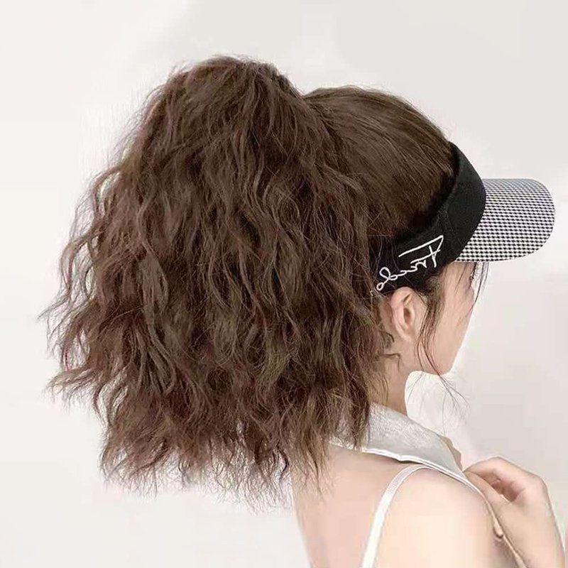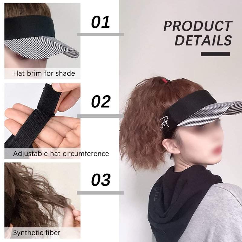 WAYUTO Ponytail Wig Baseball Cap with Hair Adjustable Houndstooth Hat with Synthetic Curly Wig Attached 13.8Inch Long Wavy Hair for Women Daily Party Use