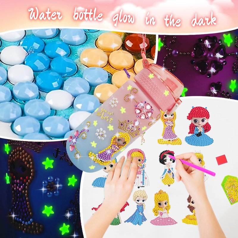 Wbesty Decorate Your Own Water Bottle Kits for Girls Age 4-12, Princess Diamond Painting with Star Glow in The Dark, Arts and Crafts Gifts for Girls Birthday Christmas Gift(Princess)