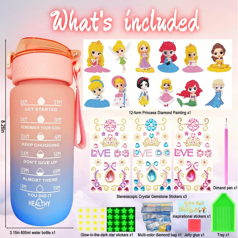 - 【Diy Water Bottle Kits for Girls】Infinite Possibilities of Styling! Girls are free to mix and match princess patterns and dimensional gemstone stickers to create their own personalised water bottle! This Princess value children's handmade set includes a 600mL pink blue gradient water bottle, princess diamond painting with 12 patterns x1, multi-color diamond bag, diamond pen, plastic tray, jelly glue, luminous Star Stickers, stereoscopic gemstone stickers x3 and inspirational stickers x1.