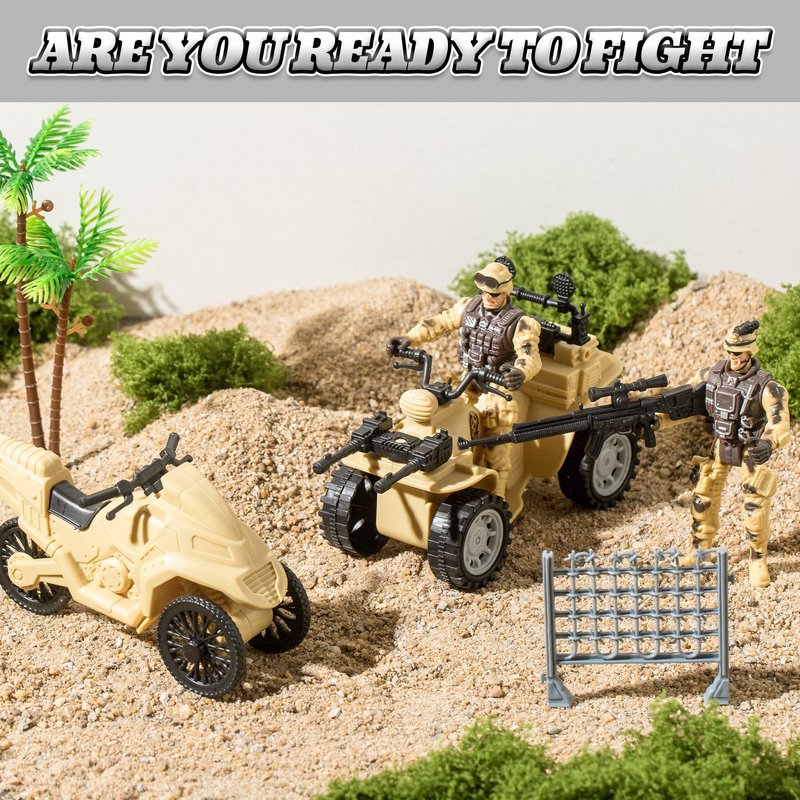 - 11-in-1 Army Men Playset Includes: This all-inclusive toy soldiers set, without complicated and boring models, featuring 1 gun piece/1 little black boat/2 military figures/1 tricycle/1 quadricycle/1 large black boat/2 pistols/1 tree/1 protective net
