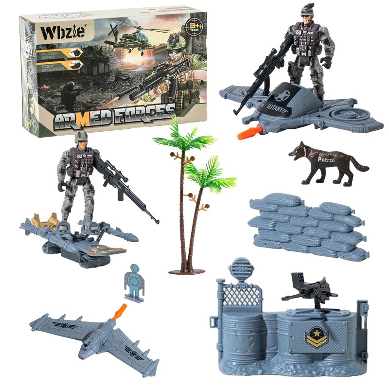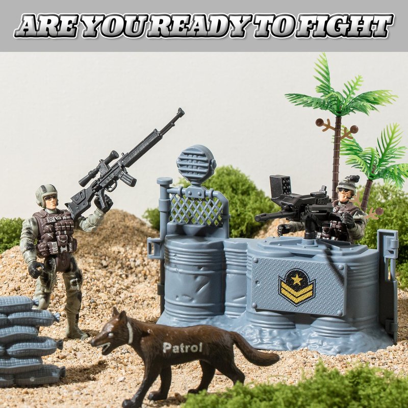 - 15-in-1 Army Men Playset Includes: This all-inclusive army toy set, featuring 1 gun piece/2 military figures/2 pistols/1 target/1 grey sandbag/1 flying saucer A/1 flying saucer B/1 tree/2 orange bullets/1 oil tank wall/1 aircraft/1 wolfhound
