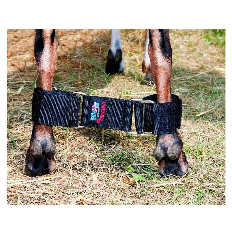 These hobbles are constructed from 2'' wide black polypropylene webbing and feature hook and loop closures for an easily adjustable, secure fit. Middle strap measures 3-1/2'' to comfortably limit the animals movement. Nickel-plated hardware. Color: Black