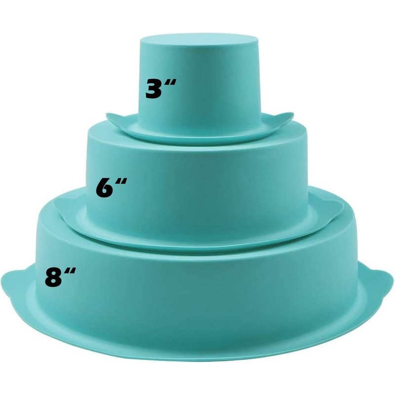 *This silicone baking pan set comes in a set of 3 molds ranging from small to large that allows you to make three tiers for cake cakes, pies, bread, mini pizzas, brownies or gelatin.