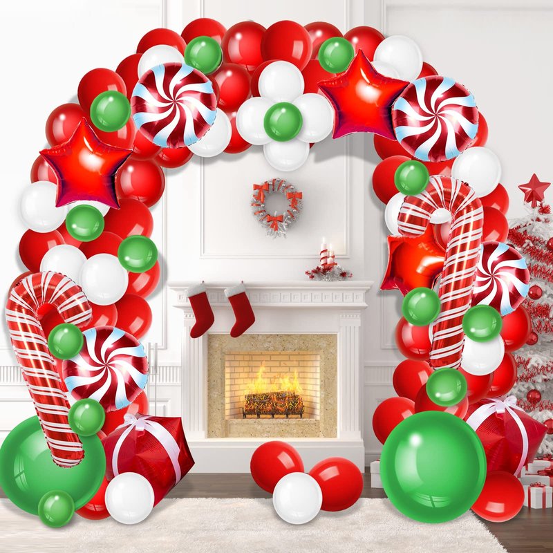 - Packaging Includes - red latex balloon(40pcs 10in+10pcs 12in) ,white latex balloon(30pcs 10in+10pcs 12in) ,dark green latex balloon(20pcs 5in+2pcs 18in),4pcs 18in candy balloon A little blue at the edges,3pcs 18in red star balloon,2pcs 24in gift box balloon,2pcs 32in Candy Cane balloon