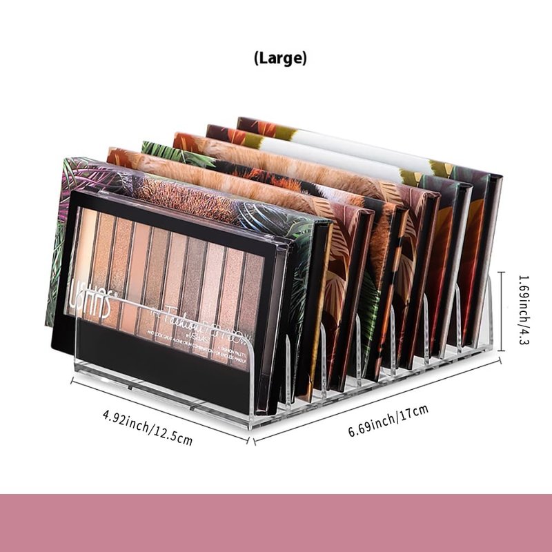- 【SIZE Eyeshadow Organizer】Size of the eyeshadow palette makeup organizer is 6.69x4.92x1.69 inches/17x12.5x4.3cm, which is suitable for various cosmetic shapes such as eyeshadow palettes, blush tray, brow kits,eyebrow repair bag,powder box and other makeup, CD display racks.