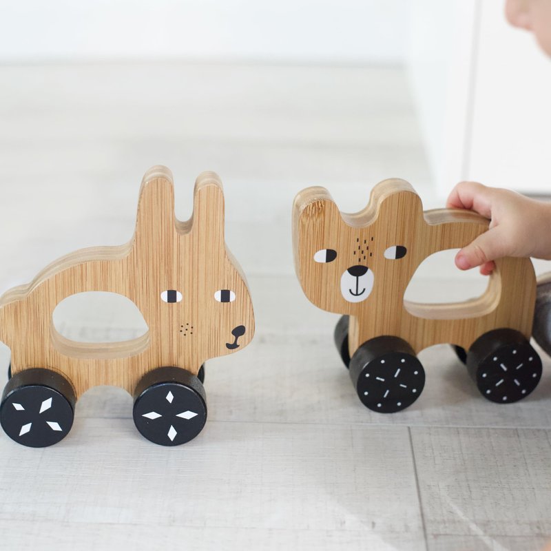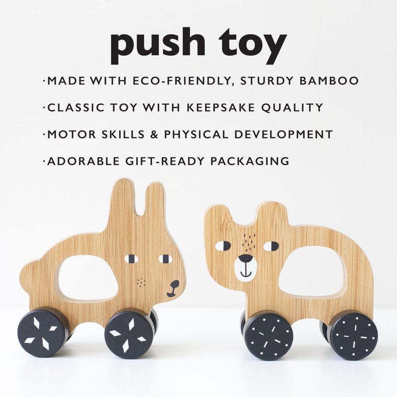 A classic heirloom toy, updated with Wee Gallery style, our Bunny Push toy is designed to help children develop their coordination, motor skills, and dexterity, while exploring motion. Made with durable bamboo and a child-safe finish, it's the perfect size for little ones to grasp, carry, and roll along with them as they grow. Recommended for ages 12 months+ (years 1, 2, 3, and up). Made of bamboo and wood, with a nontoxic shellac.