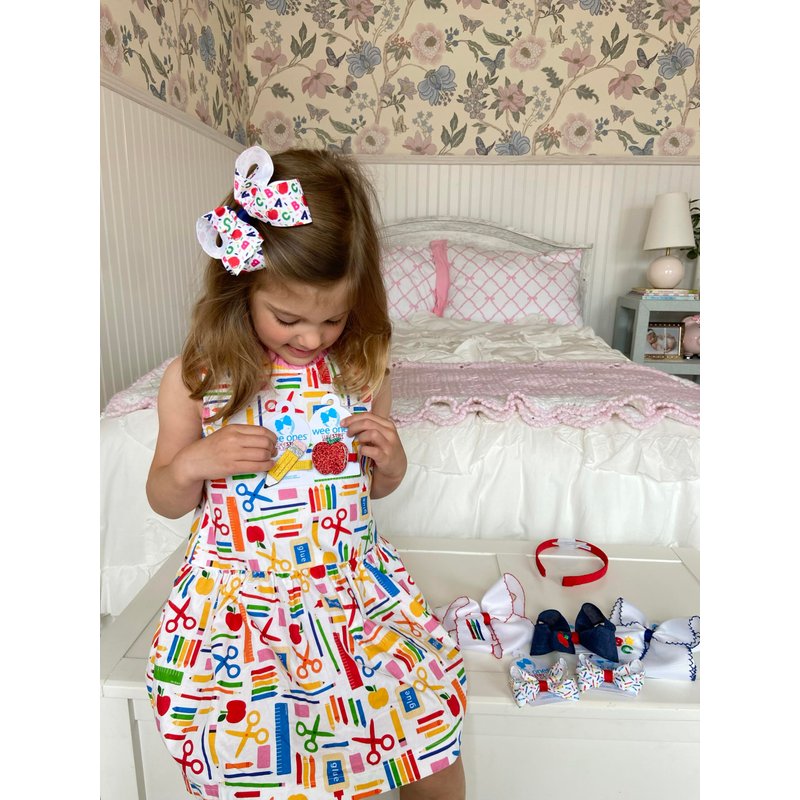 Get ready to show off your playful side with our medium navy blue linen hair bow featuring charming red apple embroidery. Perfect for back-to-school season, this bow is a playful way to show appreciation for teachers and adds a touch of fun to any playground adventure. A must-have for little bookworms and avid readers! This bow is sure to stay in her hair all day with our patented WeeStay no-slip hair clip.