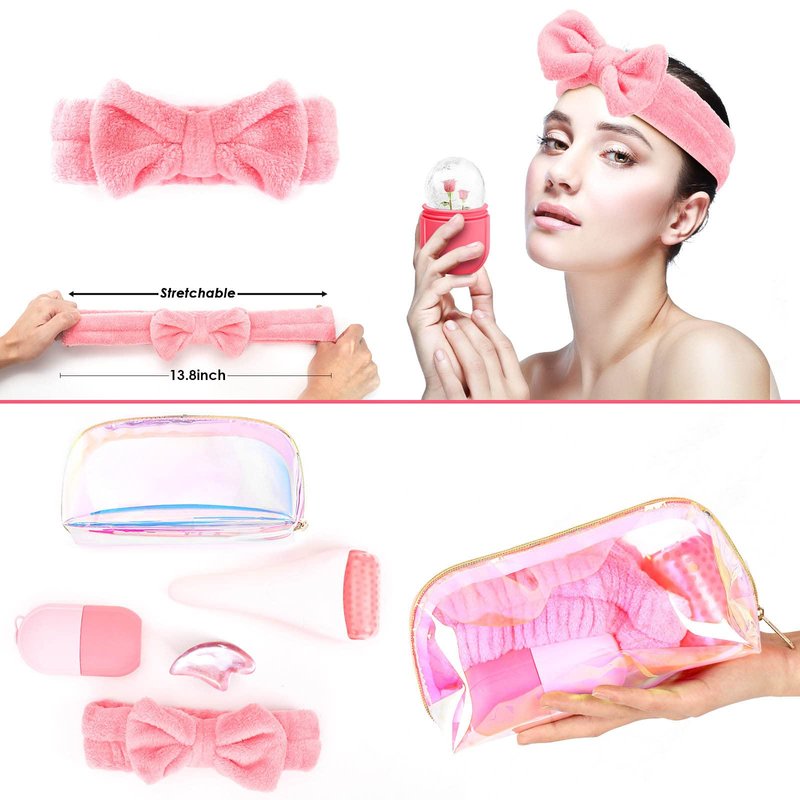 WEEGEEKS Ice Roller and Ice Mold for Face Massager Tools - 5-Piece Face Roller Skin Care Kit with Ice Face Roller, Face Ice Mold, SPA Headband, Gua Sha Tool-Beautiful Clutch Bag Included