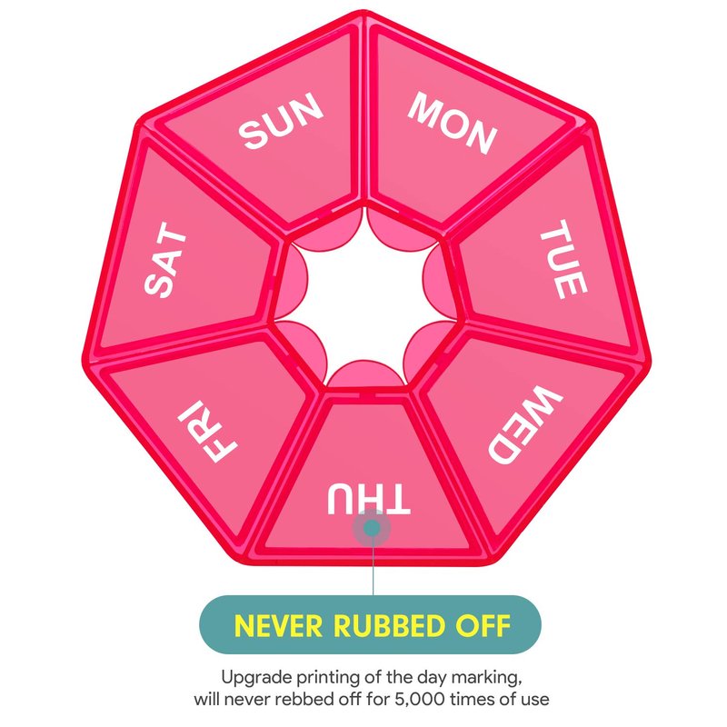 - Conspicuous Printing:Bigger printing of days of the week makes it easier for you to distinguish,let the pill dispenser organizer remember the time for you instead of by yourself,and improved printing stand usage of 10 years