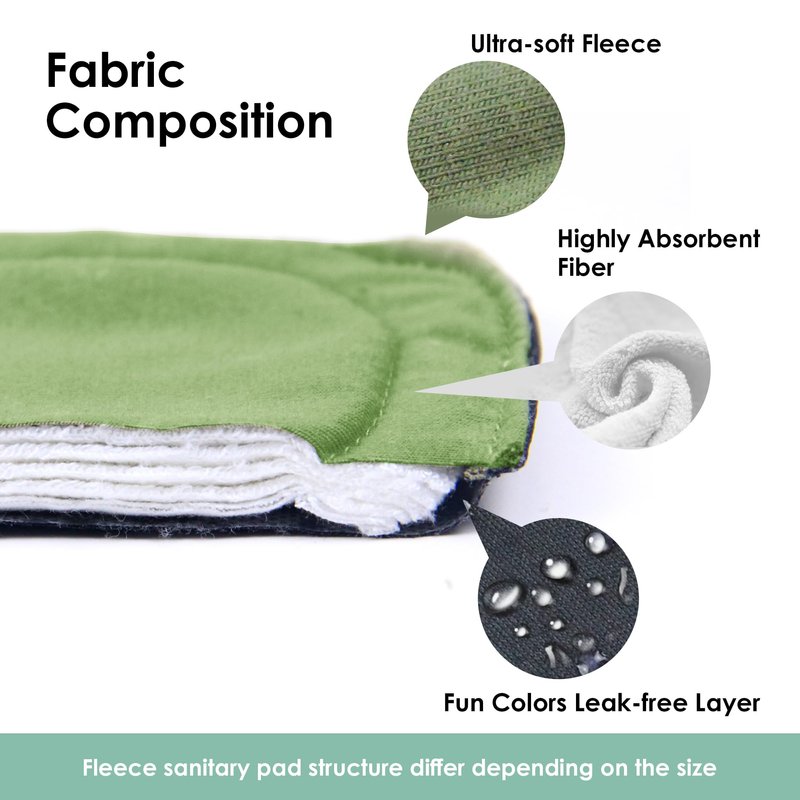 - Breathable Layer: Cloth panty liners structure differ depending on the size. Menstrual cloth pads Inner layer is ultra-soft fleece which lays against your skin, moistures wicking, and neutralizes odor.Lining layer is super-absorbent, and different sizes the layers are different. Outshell layer is leak-free TPU with backside silicon dot. The soft and gentle reusable sanitary pads offer great coverage and absorbency to keep you from any leaks and spills