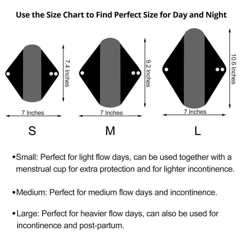 - FOUR SIZE AVAILABLE,small size length 8 linch X width (including wings) 7 inch, middle size length 9.5 inch X width 7 inch, large size length 11 inch X width 7 inch. Extra large cloth pads, length 12 inch X width 8 inch. We recommend 6-12 small/medium cloth menstrual pads and 1-3 large heavy flow mama cloth pads