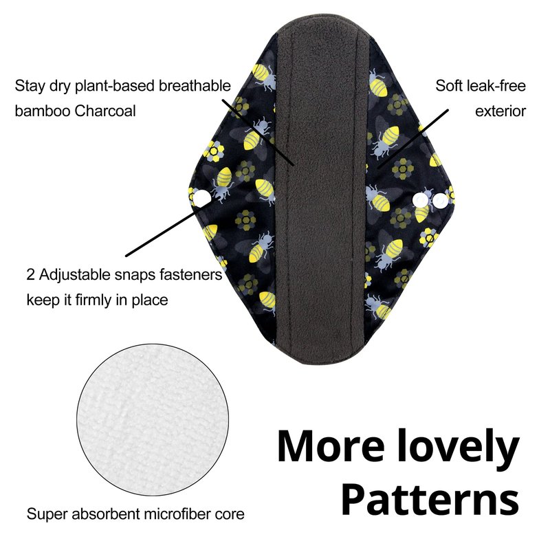 - CHARCOAL INNER LAYERS of these cloth menstrual pads is soft with maximum and have a stay dry surface.The dark color is forgiving of stains and Not only great at soaking up liquid, smells are neutralized. Middle layers microfiber make this reusable sanitary napkin super absorbent and a trend in baby cloth diapers too