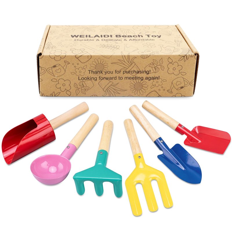 WEILAIDI Beach Toys,6 Pcs Children Beach Sand Toys,8'' Kids Gardening Set Metal Garden Tools with Sturdy Wooden Handle,Safe Kids Shovel with Cylinder, Spoon, Fork, Rake, Flat Shovel & Pointed Shovel for Kids