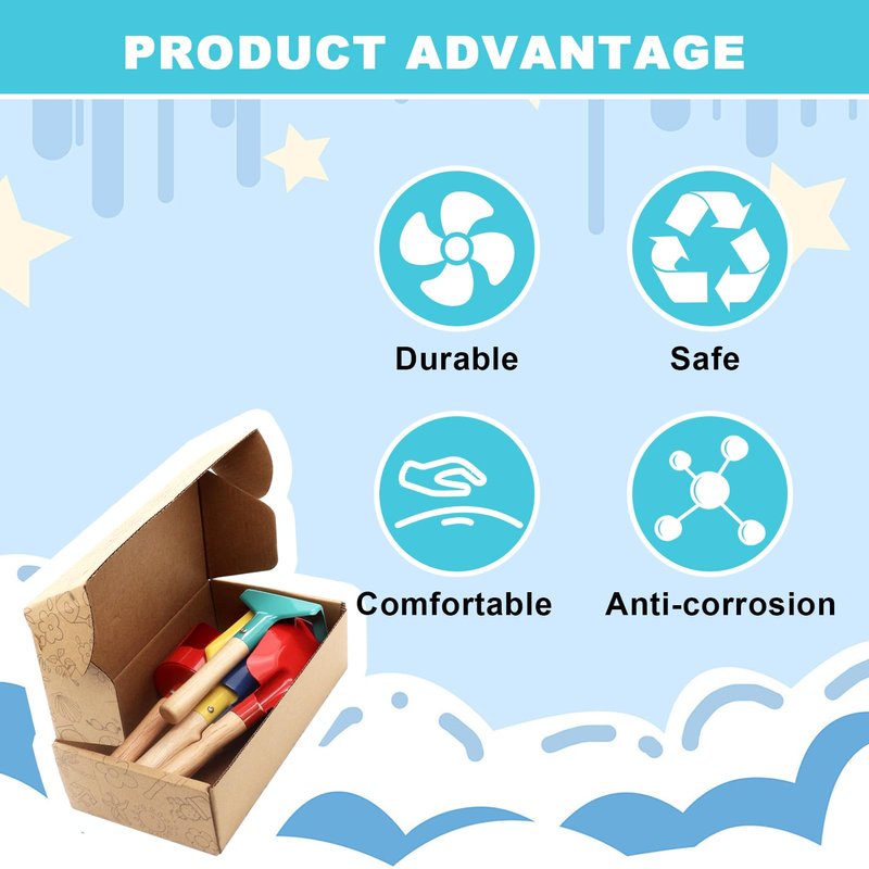 - 【Designed for Children】 The head of the tool is supported by solid iron sheet and sprayed with environment-friendly paint which is corrosion and rust resistant. Each tool is processed with rounded edges without sharp edges. The handle made of solid wood feels comfortable, free of burrs and will not hurt hands.