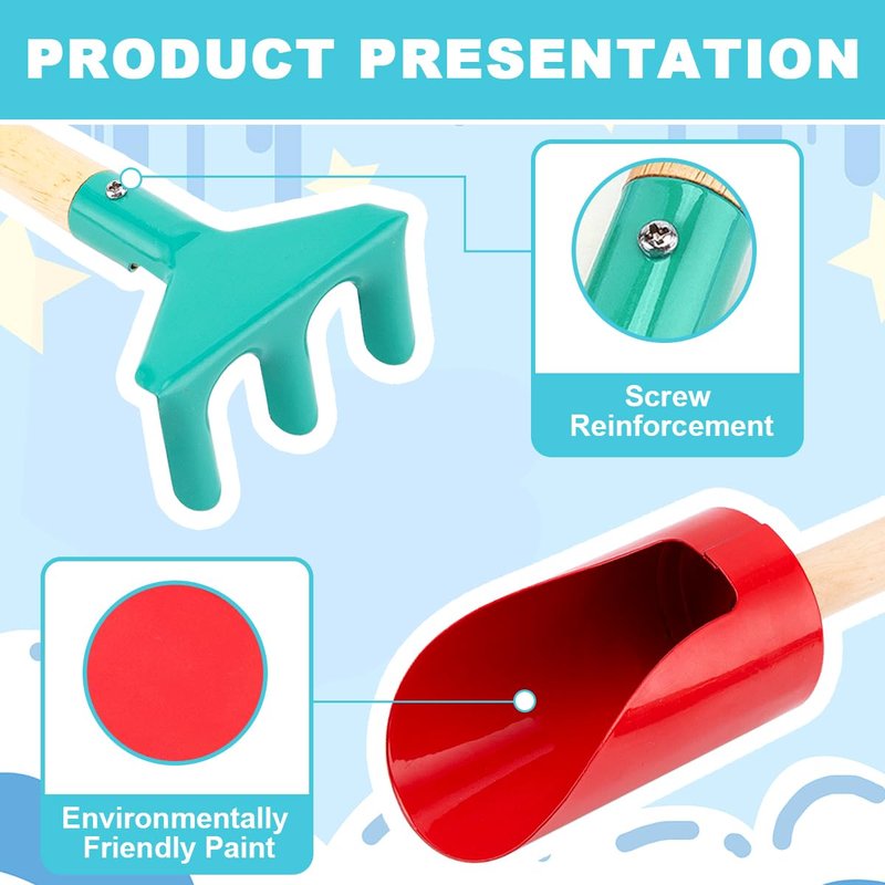 - 【Unique beach toys】The bright colors make these a favorite with kids. These tools are super cute and addorable. Suitable for flower and vegetable cultivation, weeding, loosening, transplanting seedlings, Beach play. When parents work in the garden, children can also shovel soil on the side, increase the communication and interaction between children and parents, and can also cultivate children's hands-on ability.Fun For All Ages 3 to 10.