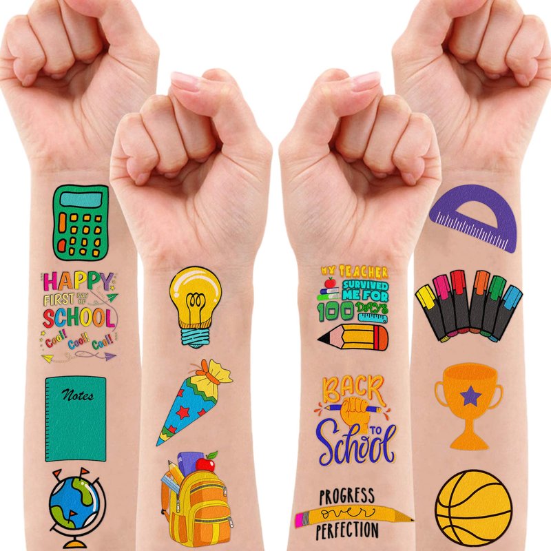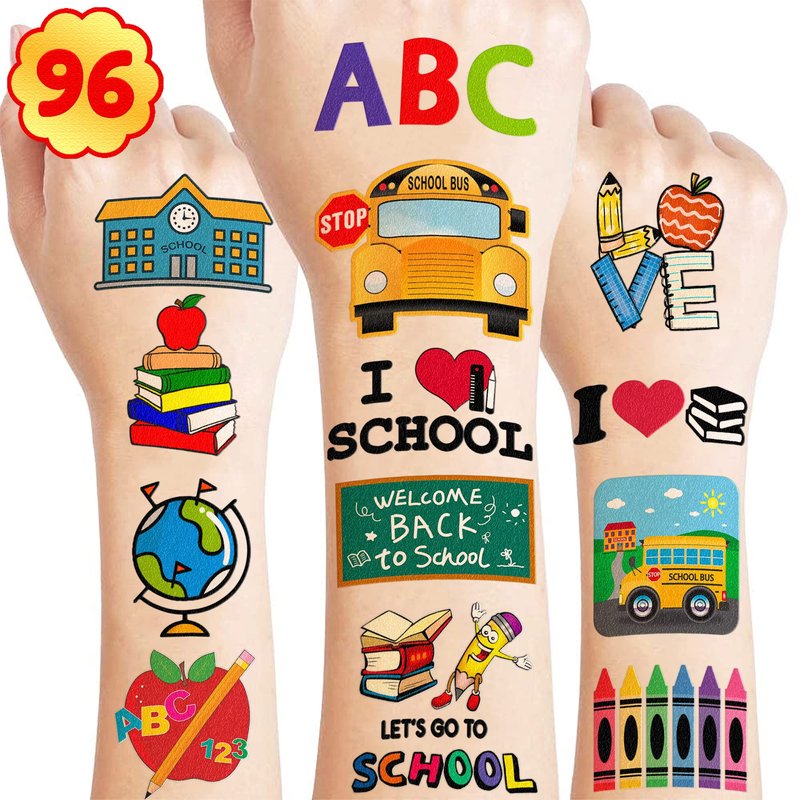 - Cute And Funny Welcome Back To School Teachers Students Bus Themed Tattoos: Cute Welcome Back To School Teachers Students Bus Science Temporary tattoos Stickers, features an assortment of themed characters, colors are bright, and designs are adorable, use them as party favors and your kids will love. Perfect for themed party, birthday activities, school reward and other party events. They will be your kids' favorite small gifts.