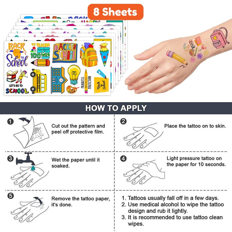 Welcome Back To School Teachers Students Bus Science Birthday Party Supplies: 8 Sheets Welcome Back To School temporary tattoos stickers, Have a variety of cartoon themed characters, Children can easily Welcome Back To School stickers and take unique photos to make fond memories. The size of each sheet is 6.1 * 3.1 inches. Welcome Back To School Teachers Students Bus Science Birthday Party Decoration: The set contains instructions for use and is easy to use. Welcome Back To School Teachers Students Bus Science tattoo stickers can be applied on arms, face, hands, neck, shoulders, legs, wrists and ankles to make you look cool at all kinds of parties. Popular hit with your kids. You can apply them to your body or some smooth objects, for example, glass, stationery, paper, crafts cups, cabinet, bottle. Cute And Funny Welcome Back To School Teachers Students Bus Themed Tattoos: Cute Welcome Back To School Teachers Students Bus Science Temporary tattoos Stickers, features an assortment of themed characters, colors are bright, and designs are adorable, use them as party favors and your kids will love. Perfect for themed party, birthday activities, school reward and other party events. They will be your kids' favorite small gifts. More Safety & Healthy Choice: These temporary tattoos are made of high quality safety and green paper, Non-allergenic, Non-toxic and totally safe for your kid's skin. Simply wet the tattoo with water and stick transferred them onto your body, hands, faces and arm you like. Tattoos will last from 3 to 5 days ,it also can be easily removed with baby oil, makeup remover or rubbing alcohol. Not recommended for people with a history of sensitive skin, if symptoms appear, stop using immediately. How to Use: Cut out tattoo of choice and remove clear sheet. Place tattoo face down on skin. Wet the tattoo thoroughly with a sponge. After 20-30 seconds, gently remove the backing paper. Allow the tattoos to dry. Very easy to use.
