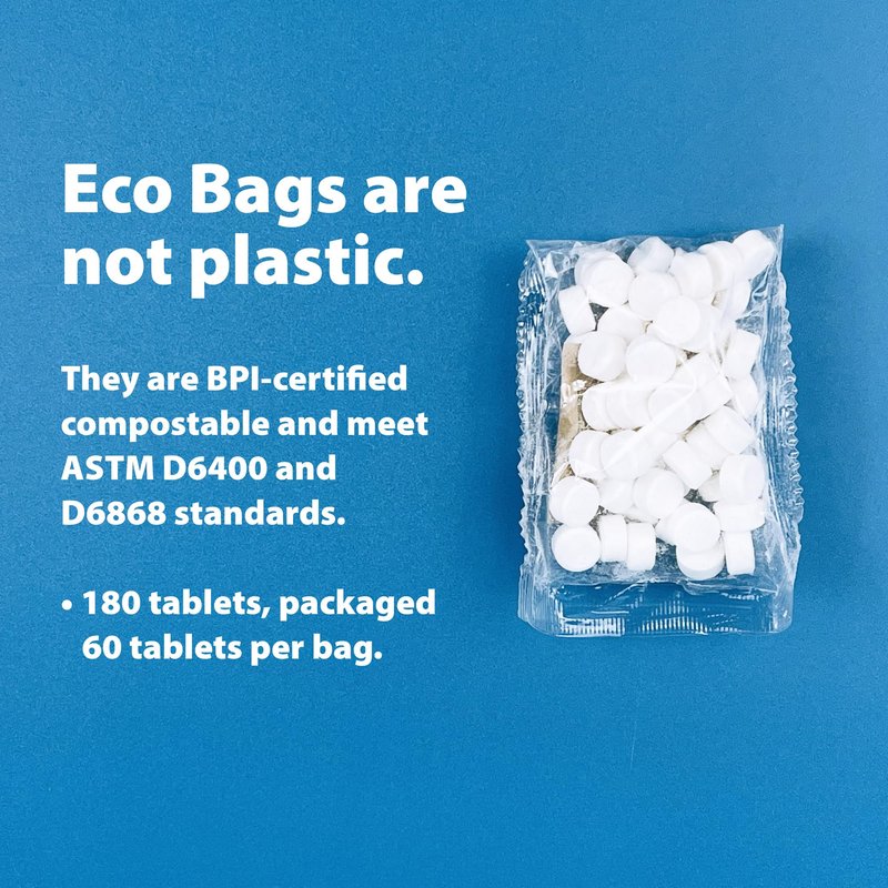 - Eco bags are not plastic. They are BPI-certified compostable and meet ASTM D6400 and D6868 standards. A cardboard tube containing 180 tablets is packaged with 60 tablets per bag.