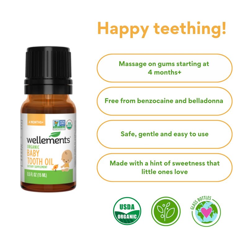 Wellements Organic Baby Tooth Oil | Soothing Massage Oil for Tiny Gums, Helps Make Teething Happy, Made with Safe and Effective Certified Organic Ingredients | 0.5 Fl Oz. 4 Months +