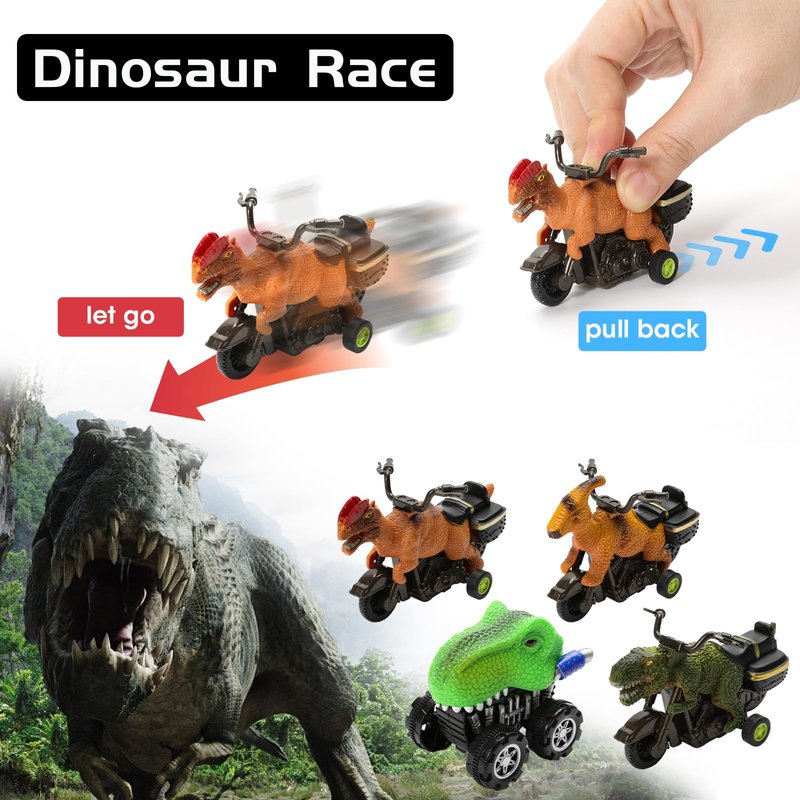 - DINOSAURS THAT RIDE MOTORCYCLES:Maybe your children have seen different types of dinosaur cars, but this ride a motorcycle dinosaur is definitely one of the brightest toys in 2023,This Dinosaur Truck Playset includes 1 large Dinosaur fossils transport truck, 1 Ejector Car, 3 pull back dinosaur cars, 6 realistic dinosaur figures, 1 jurassic world activity playmat and more, It's a fantastic gender-neutral toy,This toy is not just for boys, it's for all dinosaur lovers