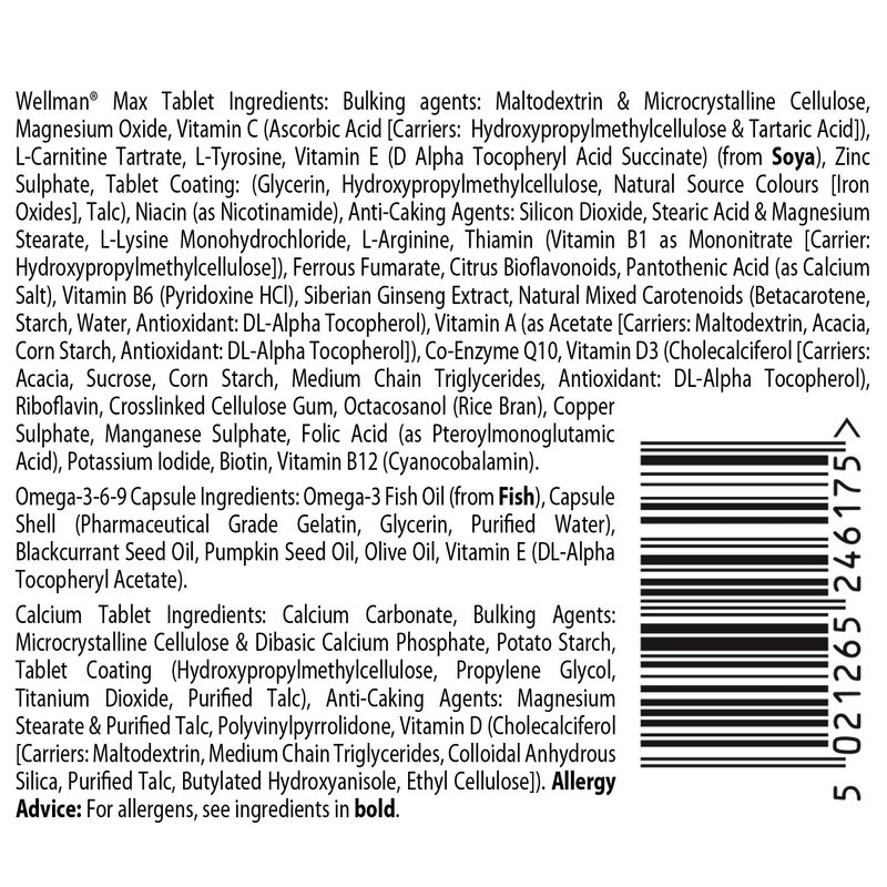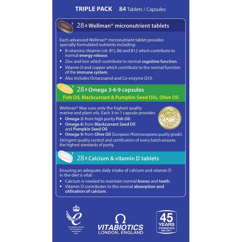 Wellman Max provides maximum support with a convenient 3-in-1 triple pack: -Advanced Wellman micronutrient vitamin and mineral tablets x 28 -High purity Omega 3-6-9 capsules x 28 -Calcium and vitamin D tablets x 28 Juggling a hectic work, home and social life often means that, while we strive for a good healthy, balanced diet every day, it may not always be achievable. Wellman Max helps to safeguard your daily nutritional intake with an advanced formula especially for men. Each advanced Wellman micronutrient vitamin and mineral tablet provides 28 specially selected micronutrients. The comprehensive formula helps maintain health and vitality with pantothenic acid which contributes to normal mental performance. It also includes B vitamins: thiamine (vit B1), B6 and B12 which contribute to normal energy release while zinc and iron contribute to normal cognitive function. A healthy immune system is important to good health. Vitamin D and copper contribute to the normal function of the immune system. The advanced formula also includes Octacosanol, Co-Q10, L-Tyrosine and Siberian Ginseng extract. To use: Take one micro-nutrient (Dark blue blister), one Omega 3-6-9 capsule (Green blister) and one Calcium tablet (Turquoise blister) per day with your main meal and water or a cold drink. Do not exceed the recommended intake. There is no need to take an additional multivitamin. Ingredients Advanced vitamin and mineral tablets: Bulking agents: Maltodextrin & Microcrystalline Cellulose, Magnesium Oxide, Vitamin C (Ascorbic Acid [Carriers: Hydroxypropylmethylcellulose & Tartaric Acid]), L-Carnitine Tartrate, L-Tyrosine, Vitamin E (D Alpha Tocopheryl Acid Succinate) (from Soya), Zinc Sulphate, Tablet Coating: (Glycerin, Hydroxypropylmethylcellulose, Natural Source Colours [Iron Oxides], Talc), Niacin (as Nicotinamide), Anti-Caking Agents: Silicon Dioxide, Stearic Acid & Magnesium Stearate, L-Lysine Monohydrochloride, L-Arginine, Thiamin (Vitamin B1 as Mononitrat