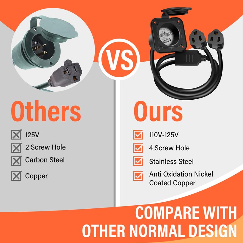 - 【15 Amp Flanged Inlet】: No oxidation for the Nickel coated copper pole on the plug, made of premium copper and Nylon plastic to avoid the damage of UV degradation and chemicals, rugged and durable for indoor and outdoor.