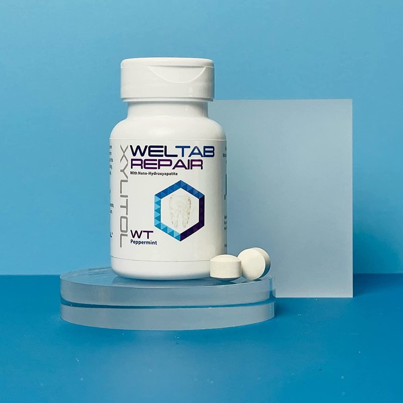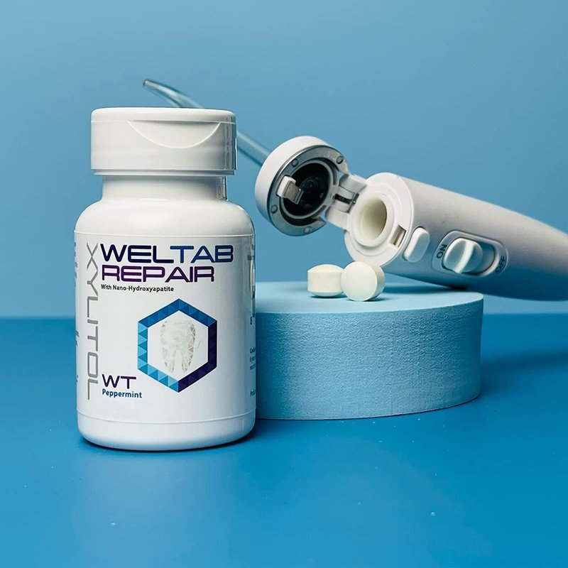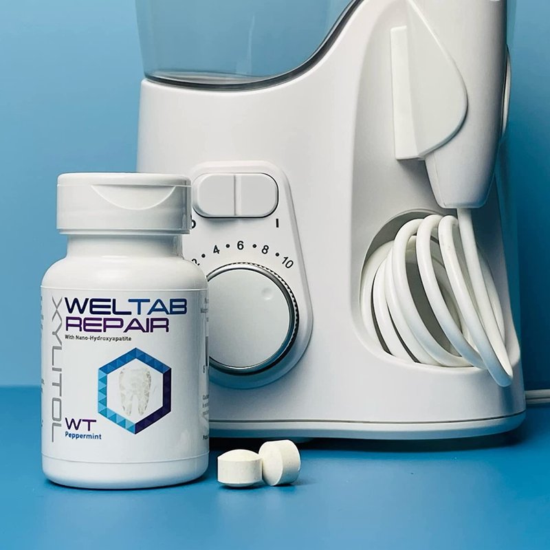 The gentle approach to better oral health. Weltab water flosser tablets are placed in the handle of models WF-05 and WF-06. These water flosser tablets do not make any whitening claim. Use Weltab twice per day for best results. Weltab Repair contains Nanohydroxyapatite which is an alternative to fluoride. It re-mineralizes enamel naturally over time. Our products also promote healthier gums by delivering Xylitol. Your mouth will become alkaline. An alkaline mouth is a healthy mouth.