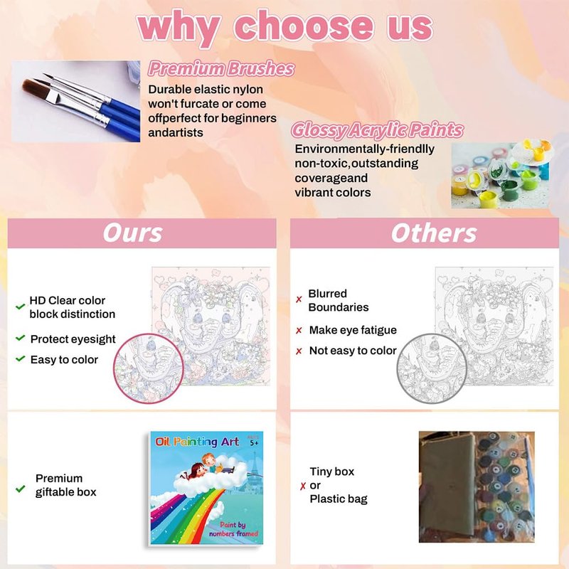- 【High Quality Materials】Our paint by number for kids is made of safe and healthy acrylic paint that kids can use with confidence.And acrylic paint does not need to be diluted,it can be used after opening,which is very convenient.Our paint by number kits use linen canvas,high-definition color base printing technology makes the numbers clearer and can effectively reduce eye strain.