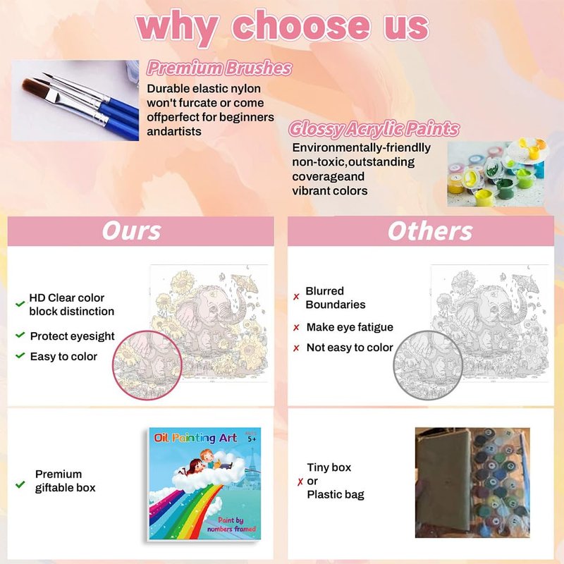- 【Benefits for kids】 Paint by numbers for kids is a DIY product that requires your kids hands to complete the painting.Paint by numbers for kids not only helps you keep your child away from electronics,but it is also perfect for improving your kids creativity,confidence,attention span and hands-on skills.