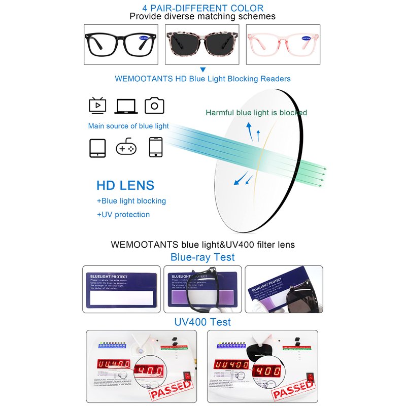 WEMOOTANTS computer readers glasses bring you a clear world and protect your eyes so you can use any electronic device as you wish without worrying about the irreversible adverse effects blue light may have on your eyes.