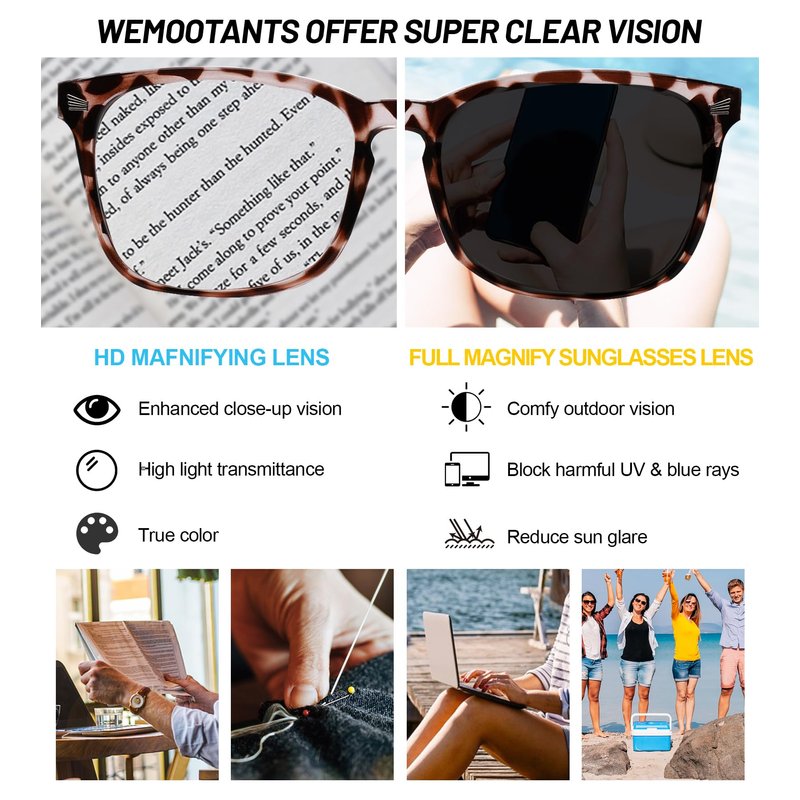- UV FILTER - Your eyes are sensitive and vulnerable to strong light. It’s important to care your eyes right now. The square grey lenses on these readers effectively blocking 100% UV400 radiation, so that you can read under the sun with comfortable and clear vision. Just basking in the sun’ s glory and enjoying your reading time with WEMOOTANTS sunglasses readers.
