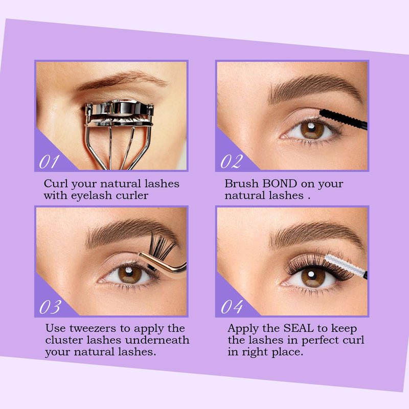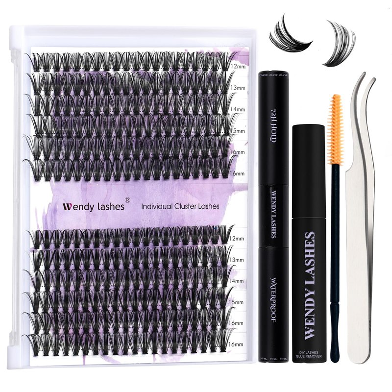 Individual Clusters Lashes Kit: Wendy lashes cluster extensions kit has a natural lashes cluster, a lash bond and seal, a eyelash remover, a eyelash applicator and lash brushes. The wispy cluster lashes are 3D effect curl and a super thin sharp tips, similar in thickness to real eyelashes.2 Style Reusable Clusters: Wendy lash clusters have 2 different kind of clusters in one tray. They are soft and not sting eyes, lightweight and no burden when you wear lashes. And eyelashes are unique design, can enlarge and highlight your eye makeup.Strong Hold Lash Bond and Seal: This lash bond offers a 72 hours long lasting and strong hold. The lash bond and seal glue is waterproof and oilproof. The individual clusters glue is suitable for cluster lashes, DIY lash extensions, individual lashes.Good Cleaning Lash Remover: Lash cluster remover has a strong cleaning, it can quickly dissolve cluster lash glue, bond and seal. Eyelash glue remover can clean eyelash glue, grease, dust and makeup residue.Eyelash Applicator with Comb: The cluster lash applicator is golden color with a comb on the tail. Tweezers for lashes are made of superior stainless steel, perfectly aligned no gaps, has a great grip. Cluster lashes applicator can easily pick up the cluster lashes and apply individual lashes extensions.