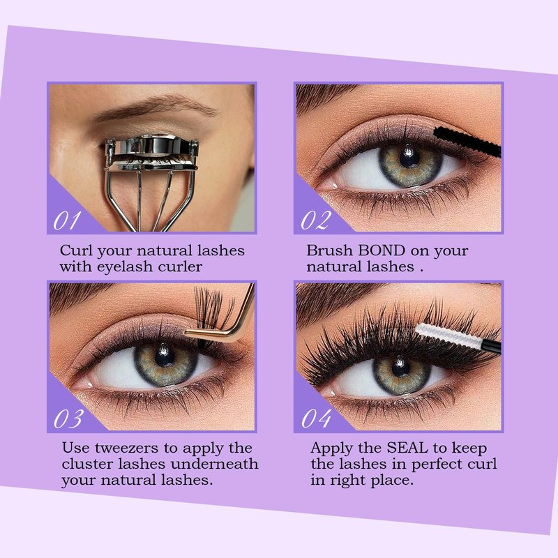 Individual Clusters Lashes Kit: Wendy lashes cluster extensions kit has a natural lashes cluster, a lash bond and seal, a eyelash remover, a eyelash applicator and lash brushes. The wispy cluster lashes are 3D effect curl and a super thin sharp tips, similar in thickness to real eyelashes.2 Style Reusable Clusters: Wendy lash clusters have 2 different kind of clusters in one tray. They are soft and not sting eyes, lightweight and no burden when you wear lashes. And eyelashes are unique design, can enlarge and highlight your eye makeup.Strong Hold Lash Bond and Seal: This lash bond offers a 72 hours long lasting and strong hold. The lash bond and seal glue is waterproof and oilproof. The individual clusters glue is suitable for cluster lashes, DIY lash extensions, individual lashes.Good Cleaning Lash Remover: Lash cluster remover has a strong cleaning, it can quickly dissolve cluster lash glue, bond and seal. Eyelash glue remover can clean eyelash glue, grease, dust and makeup residue.Eyelash Applicator with Comb: The cluster lash applicator is golden color with a comb on the tail. Tweezers for lashes are made of superior stainless steel, perfectly aligned no gaps, has a great grip. Cluster lashes applicator can easily pick up the cluster lashes and apply individual lashes extensions.