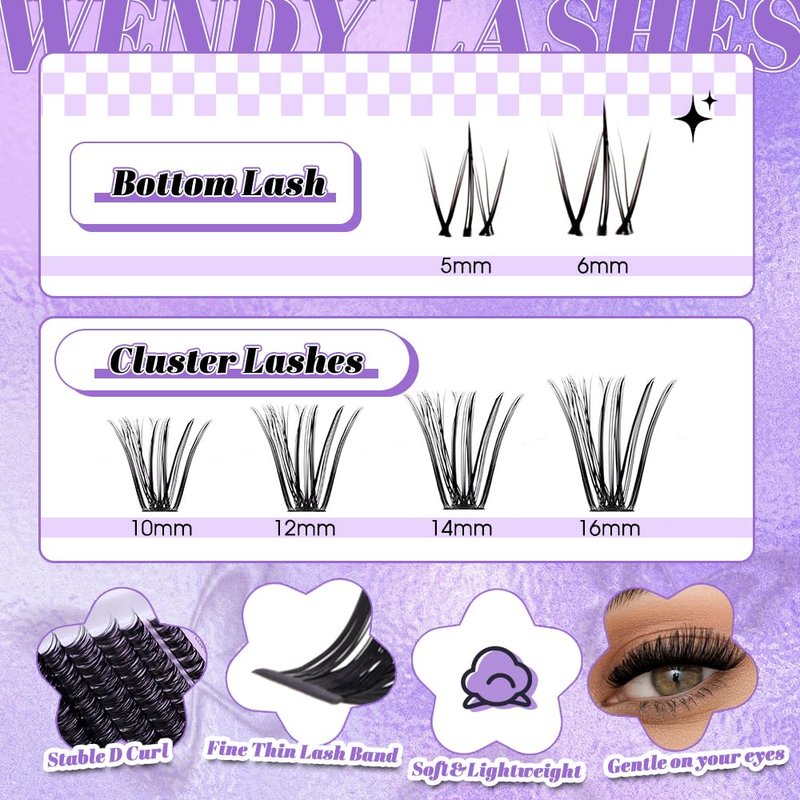 - Natural Beauty Made Effortless: Experience the natural look and feel of Wendy Lashes cluster lashes, expertly designed to mimic the texture and curvature of real lashes. Lightweight and comfortable, our lashes seamlessly blend with your natural lashes for a flawless finish that enhances your beauty effortlessly. Perfect for beginners, our DIY eyelash extension kit ensures professional-quality results at home with minimal effort required.