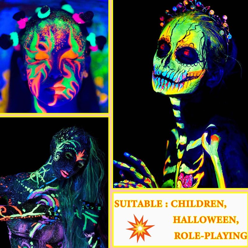 - 🌈【Neon Light Sensation】Face paint gives you a brilliant neon color in the dark, with an impressive light effect that makes you more visible.