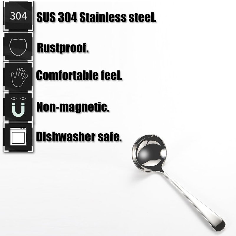 • ★MATERIAL:Stainless steel Small Soup Ladles Adopt durable SUS 304 Non-magnetic stainless steel material and mirror polishing processing technique,Safe, Rustproof, Durable and will last long.