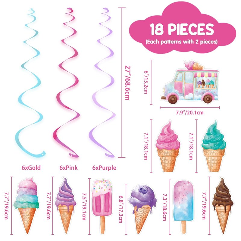 - Premium Quality:Our Ice Cream hanging sweet swirl is made of quality cardboard, printed on both sides, not easy to fade, firm and reusable; Ice Cream hanging swirl will make your ice cream party look sweet and interesting.