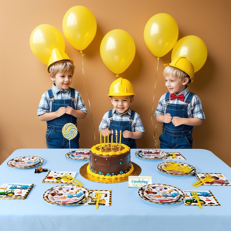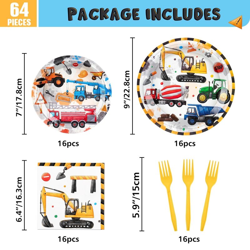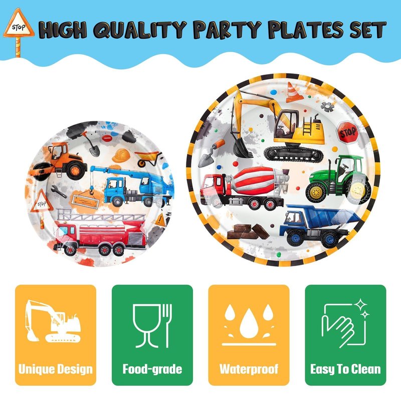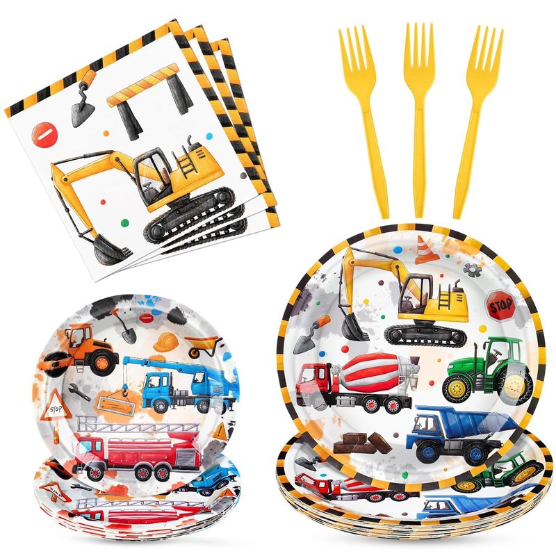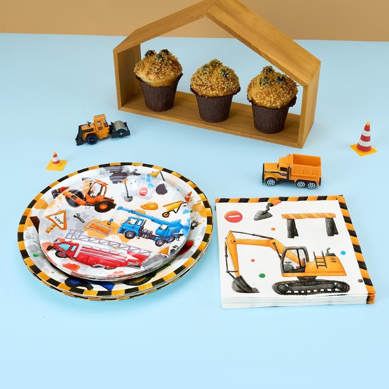 - CONSTRUCTION THEME PARTY - These tableware are carefully designed to resemble a busy construction site, showcasing colorful construction vehicles like excavators and dump trucks. Your children will be thrilled with the vibrant and engaging atmosphere you effortlessly create for the party.