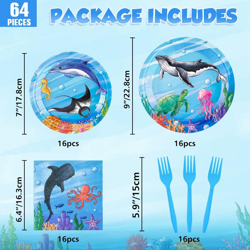 - 【PACKAGE INCLUDE】 - This kids under the sea party tableware supplies includes 22.8 cm and 17.7 cm dessert plates, printed with colorful marine elements, and along with matching napkins and forks. 16 pieces each for you to serves 16 guests.