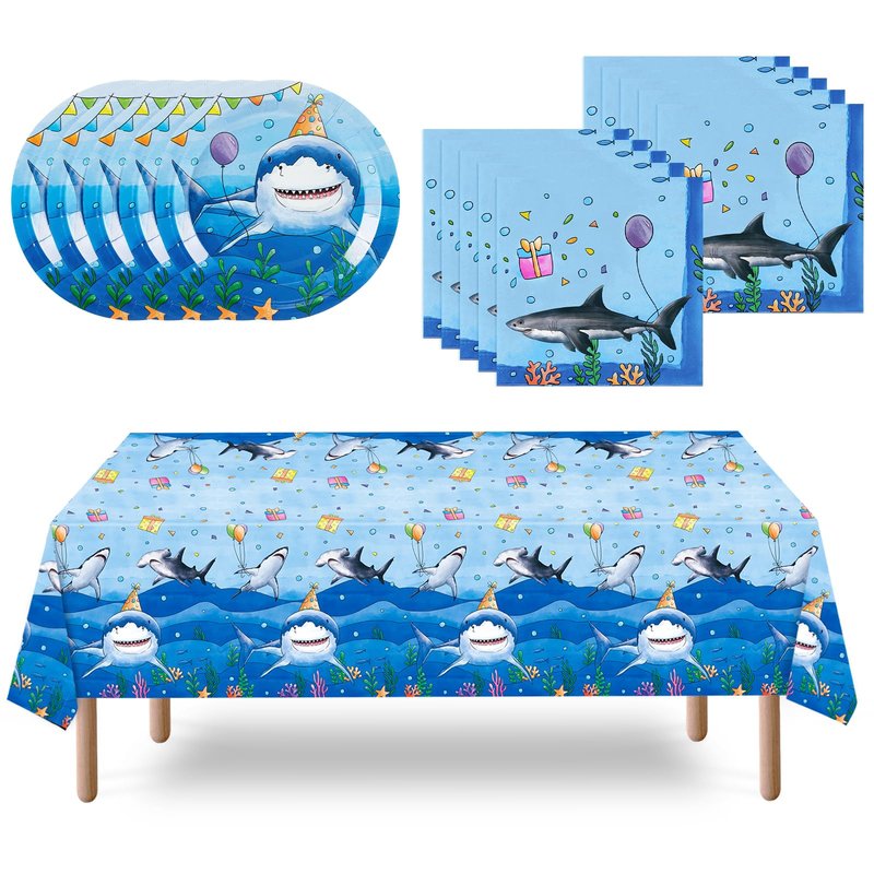 - Package Contents: Our shark party supplies set comes with a total of 33 pieces of decorations, with 16 x 7”dinner plates, 16 x 12.8” napkins, 1 x shark tablecloth, enough to entertain 16 guests.