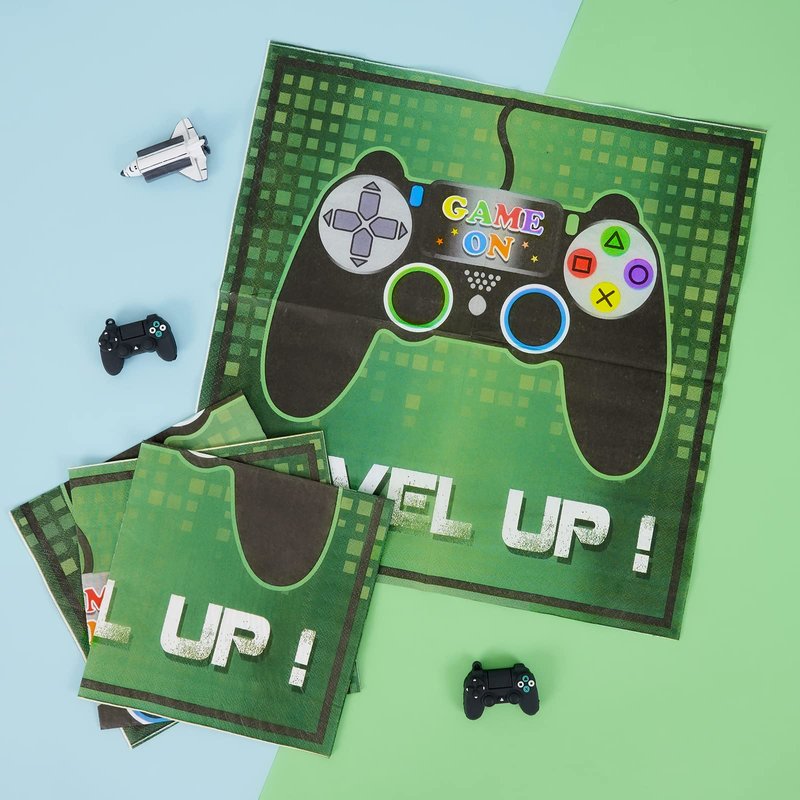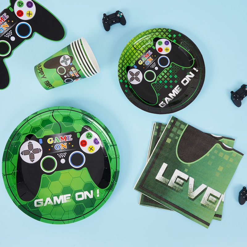 ---Features And Benefits: - Special design for boys and game player, so magical and cool. - Save preparation time and enjoy the party. This is the most important time for you. - Plates are thick and rigid to make sure won't fold while carrying food. - You would have 64 pieces video game party supplies at one time. ---Package Included: 16 × Dessert plates (7 inches) 16 × Dinner plates (9 inches) 16 × Napkins (12.8 x 12.8 inches ) 16 × Paper cups (9 oz)
