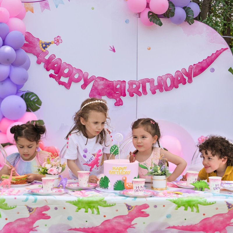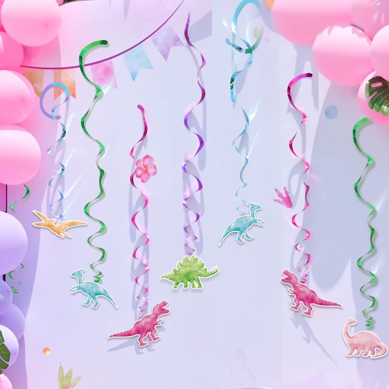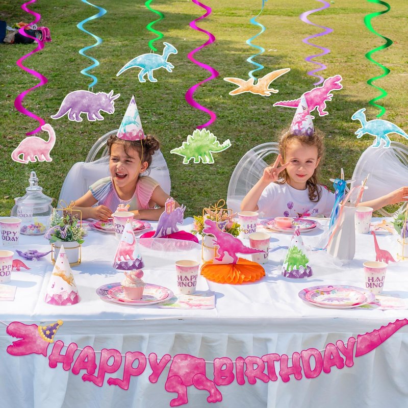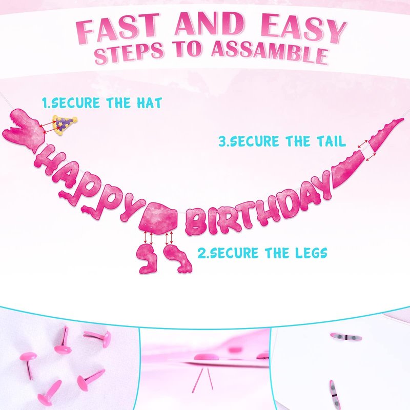 - EASY TO ASSEMBLE: This dinosaur birthday supplies set is designed for effortless setup, the pink dinosaur hanging swirls are easy to hang or disassemble, can be easily assembled with simple operations. Our banner is pre-strung, You can install it and hang it easily