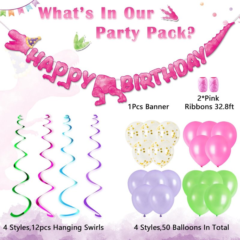 - WHAT’S INCLUDED: There are 1 dinosaur birthday banner, 14 pink balloons, 14 purple balloons, 14 green balloons, 8 golden star balloons, 12 dinosaur hanging swirls and 2 pink ribbons for a total of 65 pieces , all in one box