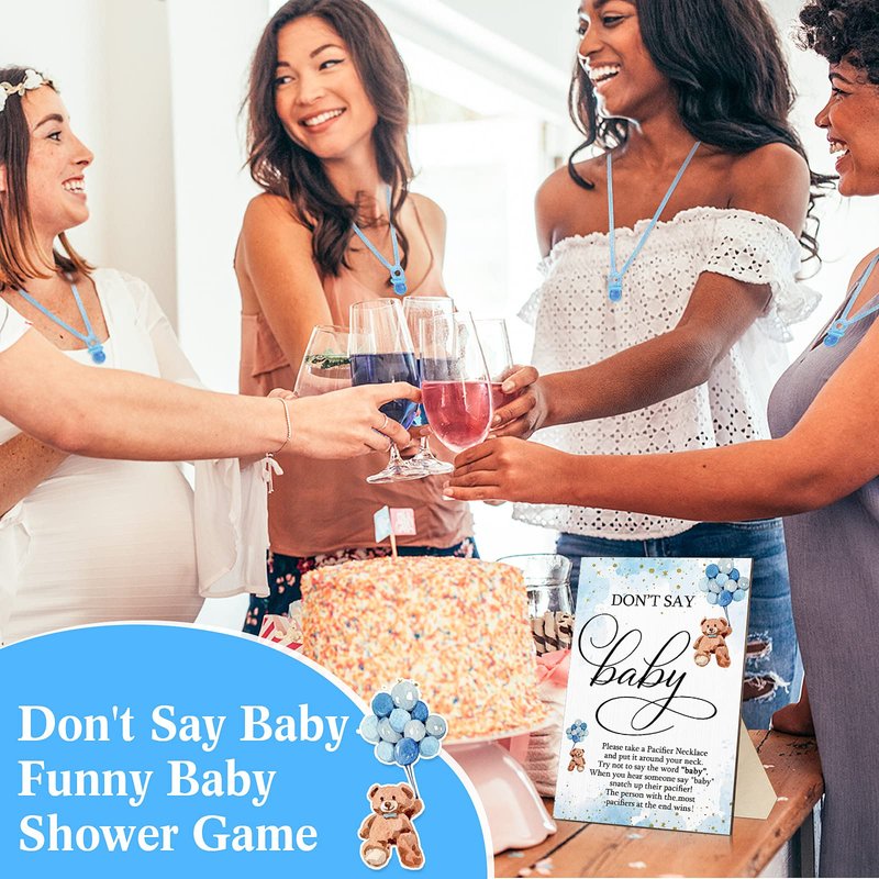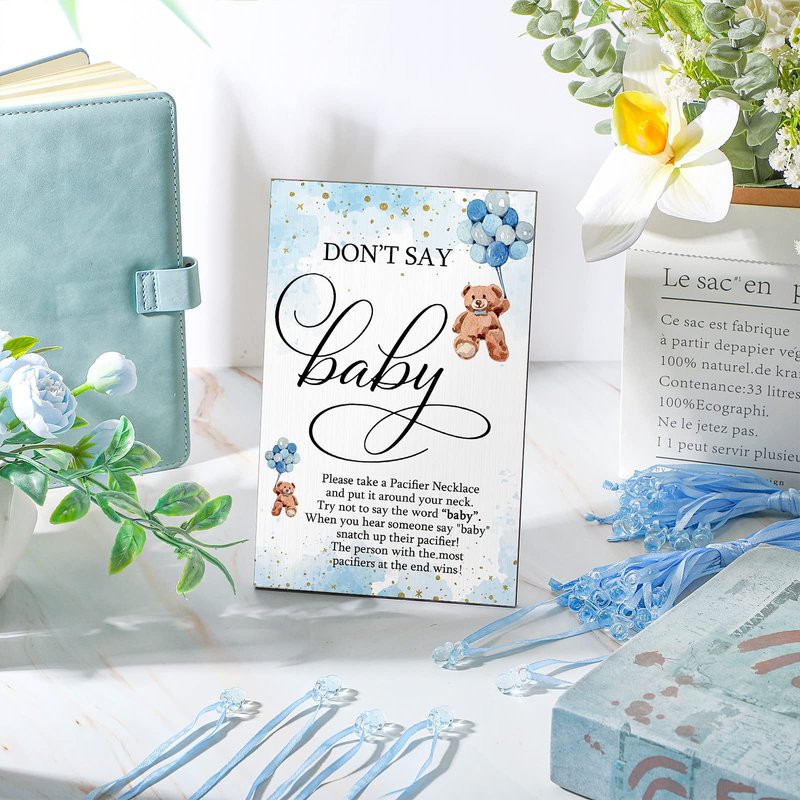 - Quality Materials: don't say baby shower game sign made of wooden, with a bracket to ensure that the sign can be done on the desktop to keep standing, sign will not bend or be damaged; The small baby pacifier necklaces are mainly made of acrylic that is clear and smooth, the smooth surface will not cause discomfort to people's skin, supporting for a long time use