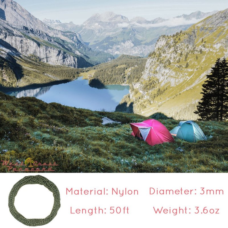 - LIGHTWEIGHT & TOUGH CORD: West Coast Paracord reflective guyline gear cord contains 50 feet (15m) of 2.5mm nylon rope. Weighing in at just 2 ounces, it's easy to take on the go in your backpack.
