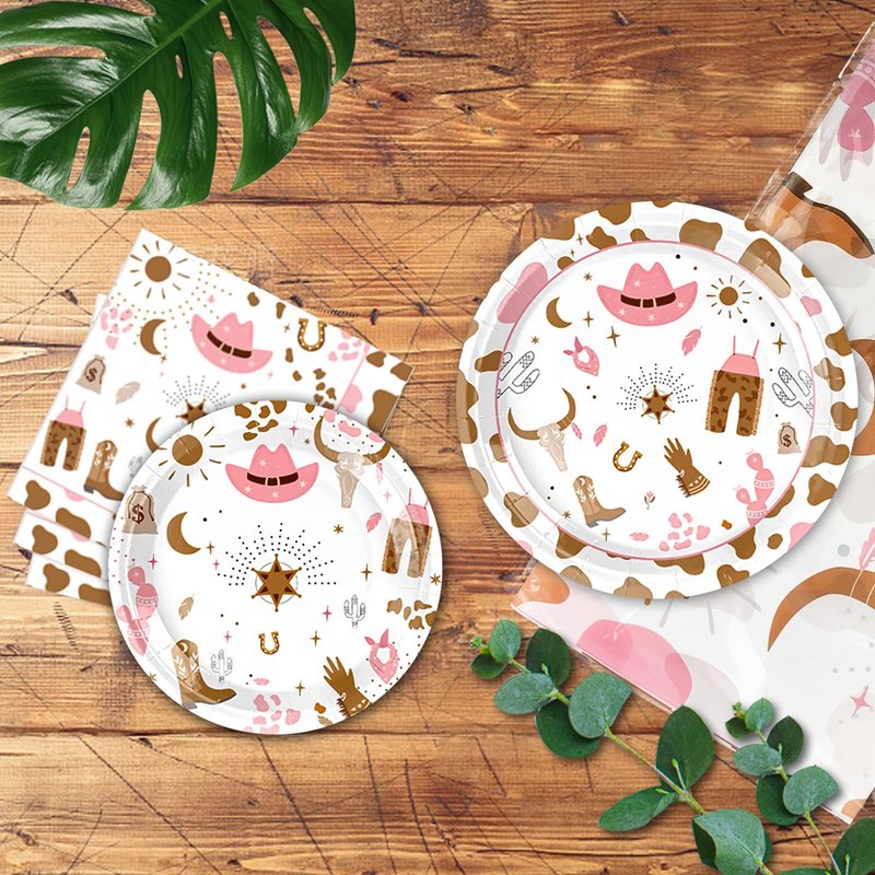 - [Stylish Cowgirl Tableware Design]: Our cowgirl party plates, paper napkins and western party tablecloth are designed cowgril, such as horseshoes,boot,hat,rompers and cow patterns that add a stylish touch to your western cowgirl party, creating a wild west cowgirl atmosphere.